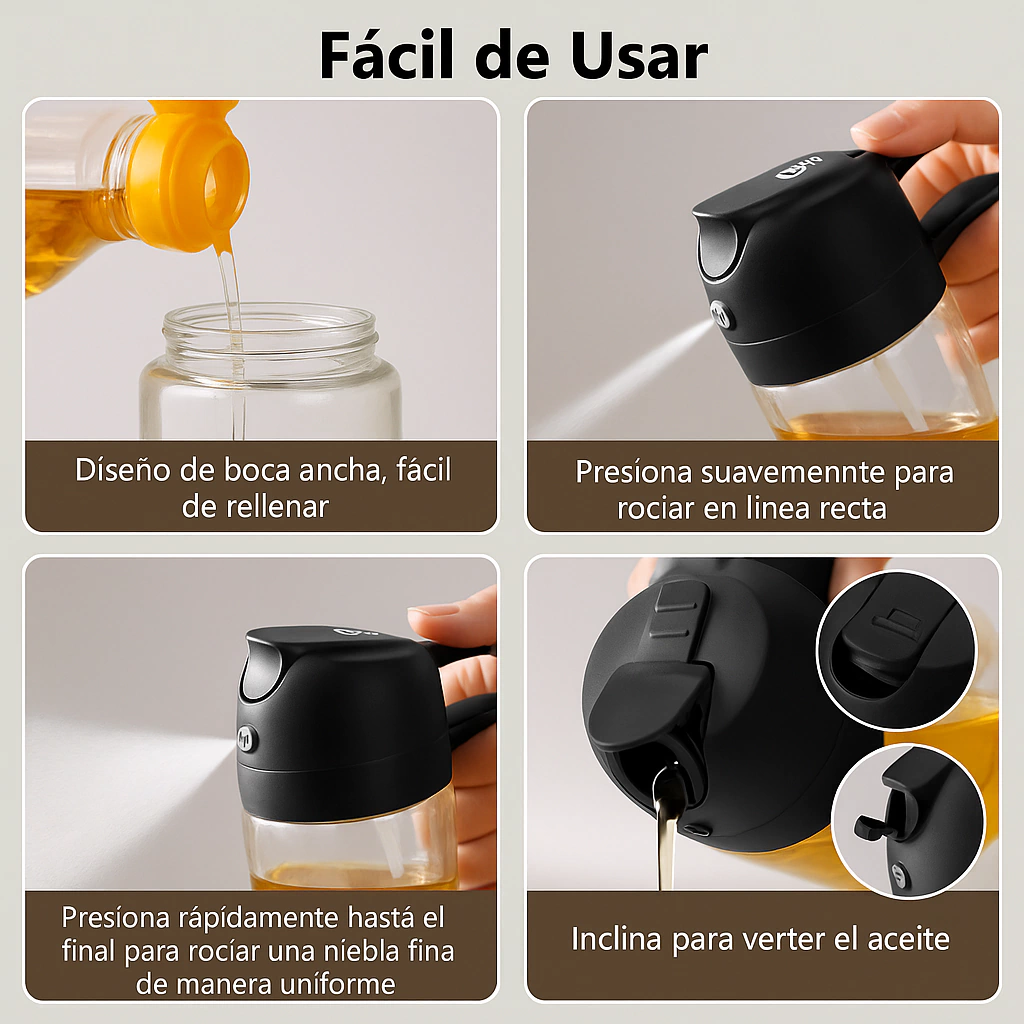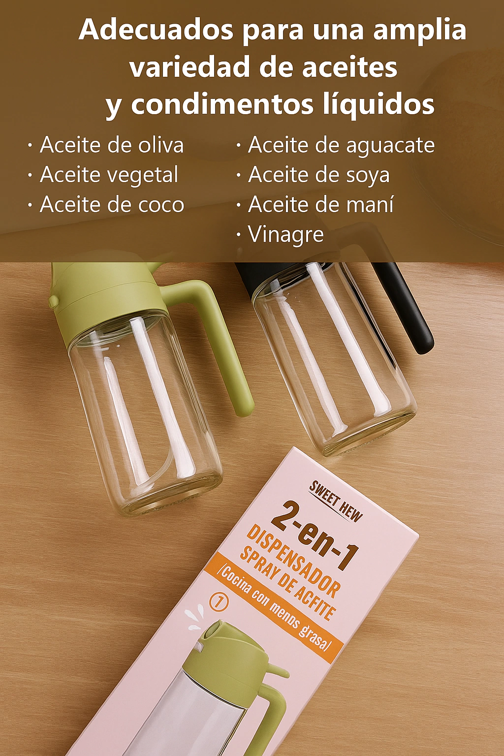 DISEÑO 2 EN 1: dispensador de aceite y rociador de aceite, puede rociar aceite para controlar la ingesta de grasas y aceites, también puede ser conveniente para verter aceite, adecuado para condimentar, asar, hornear y otros procesos de preparación de alimentos.