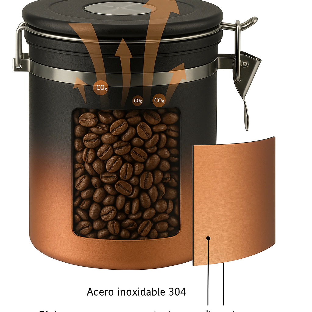 El secreto de mantenerse fresco: el café emite naturalmente CO2 que necesita ventilarse. El recipiente de café con válvula de CO2 unidireccional y el sello de goma de silicona pueden liberar CO2 pero bloquear el oxígeno, ayuda a garantizar la frescura de tus granos de café
